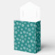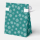 Teal blue favour box with ribbon bow. Box is emblazoned with white and grey snowflakes of varying sizes. Perfect for party take-aways, host gifts, baked goods, and more. Design is available in a curated collection of modern holiday colours. Contact us for any customisations. Happy holidays!