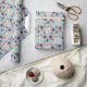 Cute snowmen with scarves and top hats are surrounded by falling snowflakes and Christmas berries on this festive wrapping paper.