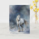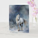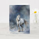 Winter Solstice blessings card with a pretty white horse in the snow as the night begins to fall. A spiritual type poem blessing.