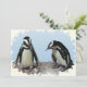 This invitation to a winter solstice party features two adorable African Penguins standing on a rocky ledge. They are aquatic, flightless birds whose wings have become flippers. Each has a black stripe and black spots on the chest. The pattern of spots is unique for every penguin, just like human fingerprints. They have pink glands above their eyes and pink and black feet. All text on the back can be customised with your personal party information.
