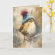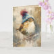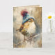 This expressive songbird features warm golden-brown plumage paired with a cozy blue pom hat. Painterly textures and layered neutrals give the artwork depth and warmth, creating a playful yet refined winter scene. A delightful card for bird lovers and seasonal greetings alike.