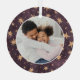 A sweet Christmas photo ornament displaying a favourite photo in a round layout, on a burgundy plum watercolor background dotted with golden stars.