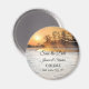 A romantic Save the Date magnet featuring a winter wonderland at sunset with festive string lights and sparkling snow.