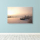 Canvas landscape print of a sunrise over a frozen canal with snow and a boat with some windmills in winter at Kinderdijk in the Netherlands.