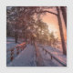Winter landscape with covered in snow pine and fir trees during sunset. View of coniferous forest with wooden pathway near sea coast.