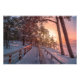 Winter landscape with covered in snow pine and fir trees during sunset. View of coniferous forest with wooden pathway near sea coast