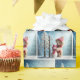 A cosy scene features a teddy bear dressed in a red hat and scarf beside a small snowman adorned with matching attire