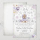 Celebrate the arrival of your little one with this charming winter-themed baby shower invitation featuring a cute teddy bear in a purple outfit surrounded by snowflakes and pastel florals. Perfect for a cozy seasonal gathering, this elegant design sets the tone for a joyful celebration. With its snowy landscape background and stylish typography, its an ideal choice for parents-to-be who want a festive yet heartwarming invitation. Great for winter baby showers, this card blends whimsy and sophistication to delight guests and create lasting memories.