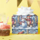 A cosy scene features a teddy bear and a snowman dressed in matching red hats and scarves enjoying a winter wonderland