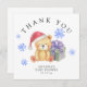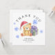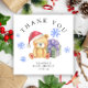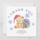 Watercolor cute teddy bear with christmas gift, in santa hat. On the reverse side of the card are holiday christmas pattern (candy cane, christmas tree ball toy, christmas socks).
