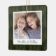 A beautiful double sided Christmas photo ornament displaying a favourite photo on each side, on a dark hunter green watercolor background dotted with pine trees. Personalise with a custom caption on the front in handwritten lettering, and add the year to the back.