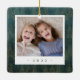 A beautiful double sided Christmas photo ornament displaying a favourite photo on each side, on a dark teal watercolor background dotted with pine trees. Personalise with a custom caption on the front in handwritten lettering, and add the year to the back.