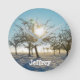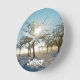 Trees at sunrise in winter with snow and sun in the morning fog with your name