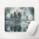 A serene forest scene reflects perfectly on the still water with soft light filtering through the frosty mist
