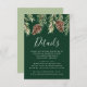 Rustic wedding details card featuring a top border of watercolor pinecones and pine boughs with a forest green background. "Details" is displayed in a modern calligraphy script with your wedding details shown below. Designed to coordinate with our Winter Watercolor Pinecone wedding collection.