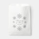 These silver snowflake winter wedding favour bags feature modern, silver, faux glitter snowflakes. Names and date are customisable. Available in three different bag colours.
