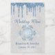 Mini Winter wedding wine bottle labels done in graphics of a white sequence looking background, with blue dripping glitter and a pretty blue snowflake. Personalise the text for your wedding favours.