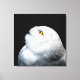 Portrait photograph of a beautiful white Snowy Owl with yellow eyes on black background.