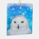 A beautiful white snowy owl with bright yellow eyes, on a blue sparkle snowflake background. A beautiful ornament for your Christmas tree and the ideal gift idea for the owl lover.