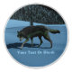 A wolf walking on hard-crusted snow at night; a tree-covered peak in the background. The wolf's eyes glow with reflected moonlight. Add your own text.