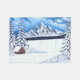 A fleece blanket with a beautiful winter scene including snowy mountains, rustic cabin and evergreens in heavy snow. Original artwork by W.B.