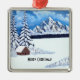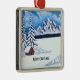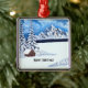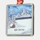 A metal ornament with a beautiful winter scene including snowy mountains, rustic cabin and snow covered evergreens. Original artwork by W.B.