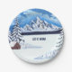 A plate with a beautiful winter scene including snowy mountains, rustic cabin and snow covered evergreens. The image and text can be personalised. Original artwork by W.B.