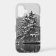 This photograph, presented in black and white, depicts the beauty of evergreen trees by a lake on a snowy winter day. It transmits the peace and tranquillity that comes with a fresh blanket of snow and the fairyland it creates -- truly a Winter Wonderland! Looking closely, the viewer will note that the photo was taken as snow was falling (and falling), adding unique effects to this idyllic scene.