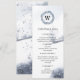 Beautiful and elegant customisable Christmas dinner menu in watercolour winter landscape with winter foliage blue wreath holding a custom monogram.. Slim style of the card has enough space for all needed information. Customise with menu specifics and occasion in provided fields with sans serif minimalist font.