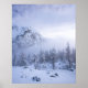 Fog rolling through the spruce forest with mountains above. Beautiful winter wonderland scene.