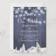 Rustic elegant winter wedding stylish invitation template on blue barn wood featuring pine trees wonderland border, white snowflakes border, and strings of twinkle lights.+++++++++++++++++++ The invitation is suitable for elegant winter rustic country mountains resort blue and white seasonal weddings.