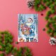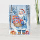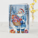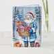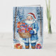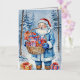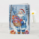 This design features a figure dressed in a blue Santa Claus outfit, holding a wicker basket full of red and white gift boxes. Additional gift boxes are placed on the snow-covered ground beside the figure. The background depicts a snowy landscape with tall, thin trees and falling snowflakes. The non-traditional blue attire for Santa adds a unique twist to the classic holiday scene, evoking feelings of warmth and generosity.