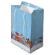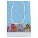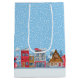 Our Winter Wonderland Snowfall & Cabins Light Blue Gift Bag design features watercolor illustration of snow topped cabins in shades of red, blue, light blue, white and tan surrounded by evergreen pine trees white confetti snowflakes gently falling all around.