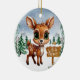 Winter wonderland wildlife deer holiday decor ceramic ornament! Featuring a cute baby doe in front of a snowy forest, complete with snowflakes falling gently. A sign reads "Let It Snow." The vibrant, wintry cartoon graphic illustration scene captures the cozy joy of the season, with evergreen forest. This two-sided decoration hangs beautifully on your Christmas tree, wreath, or as a festive gift. Perfect for whimsical fawn animal lovers, or anyone dreaming of a white Xmas—customize to make it uniquely yours!