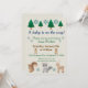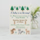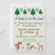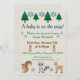 This winter woodland animal theme baby shower invitation features a silver colour background, green pine trees with blue snowflakes. It also features bears, a squirrel, racoon and deer. The fill in the blank templates assist your in customisation. Place your order today!
