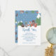 Adorable thank you card for a winter baby shower, featuring a squirrel, rabbit, fox, bear, and owl out in the snowy forest.