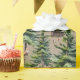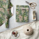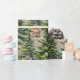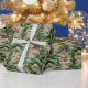 A beautiful watercolor-painted woodland forest wrapping paper featuring a repeat pattern of luscious fir and spruce trees forming a forest with winter forest animals roaming through under the season's first snowfall on a Kraft brown colour background.