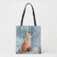 This design features a watercolor illustration of a wintry woodland scene with fox