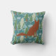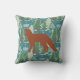 A colourful winter woods with red fox patterned throw pillow with a pretty teal blue sky, snowflakes, clouds, evergreen trees covered with snow, and little red foxes! The front and back both have one larger silhouette red fox!
