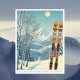 Hello from the snowy mountains of Wintergreen, Virginia, Blue Ridge Mountains! We hope you're having a wonderful ski vacation. This postcard features a gorgeous blue-grey mountain landscape with retro ski boards in an orange tribal pattern.
