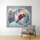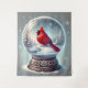 A vibrant red cardinal perched inside an ornate snow globe, surrounded by a frosty winter landscape with snowy trees and delicate snowflakes.