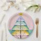 A vibrant, stylized composition depicting a Christmas tree in an abstract, layered landscape. The artwork features a distinct, dark central tree trunk and bare, snow-dusted branches reaching out across horizontal, triangular planes of color. These layers, rendered in soft pastel hues of pink, pale lavender, teal, and gold, suggest snow-covered tiers or an ethereal mountain range. A bright, golden, five-pointed star crowns the apex. The surface has a rich, textural quality, as if painted with thick paste or gouache. Gold accents highlight small, glowing spheres scattered across the branches and within the colorful layers, suggesting festive ornaments or winter light. The overall mood is cheerful, modern, and serene.