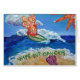 The painting shows a glimmering orange surfing angel on a blue ocean with a sparkling sun. Seafoam washes up on the sand surrounding the words "Wipe Out Cancer". There is a pink seashell on the beach. The painting was rendered in acrylic and sprinkled with glitter for texture and shine. Make custom cancer greeting cards for personalised wellness messages.