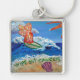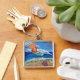 The painting shows a glimmering orange surfing angel on a blue ocean with a sparkling sun. Sea foam washes up on the sand surrounding the words "Wipe Out Cancer". There is a pink sea shell on the beach. The painting was rendered in acrylic and sprinkled with glitter for texture and shine. Personalise this keychain with your own images and messages using the "Customise It" button.