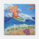 The painting was made for a group fundraising for the American Cancer Society's "Relay for Life". The booth theme was luau of "Wipe Out Cancer". The painting shows a glimmering orange surfing angel on a blue ocean with a sparkling sun. Sea foam washes up on the sand surrounding the words "Wipe Out Cancer". There is a pink sea shell on the beach. The painting was rendered in acrylic and sprinkled with glitter for texture and shine. The image was converted into cards that the team could use for the luminarias.