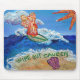 The painting was made for a group fundraising for the American Cancer Society's "Relay for Life". The booth theme was luau of "Wipe Out Cancer". The painting shows a glimmering orange surfing angel on a blue ocean with a sparkling sun. Sea foam washes up on the sand surrounding the words "Wipe Out Cancer". There is a pink sea shell on the beach. The painting was rendered in acrylic and sprinkled with glitter for texture and shine. The image was converted into cards that the team could use for the luminarias.