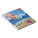 The painting shows a glimmering orange surfing angel on a blue ocean with a sparkling sun. Sea foam washes up on the sand surrounding the words "Wipe Out Cancer". There is a pink sea shell on the beach. The painting was rendered in acrylic and sprinkled with glitter for texture and shine. Personalise this cancer angel notepad with your own text and images using the customise it option.