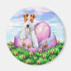 Celebrate Easter with this Wire Fox Terrier hatching from a coloured egg with coordinating tulips growing all around.