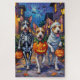 Adorable Wire Fox Terriers dressed in playful Halloween costumes carry pumpkin buckets while trick-or-treating under the moonlit sky. This festive design highlights the breed’s wiry coat, alert expression, and energetic personality, perfectly capturing the spooky yet fun atmosphere of Halloween night. A cheerful and lively celebration for dog lovers and Halloween fans alike.