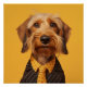 Funny and cute wire haired dachshund wearing a blazer and yellow shired with tie